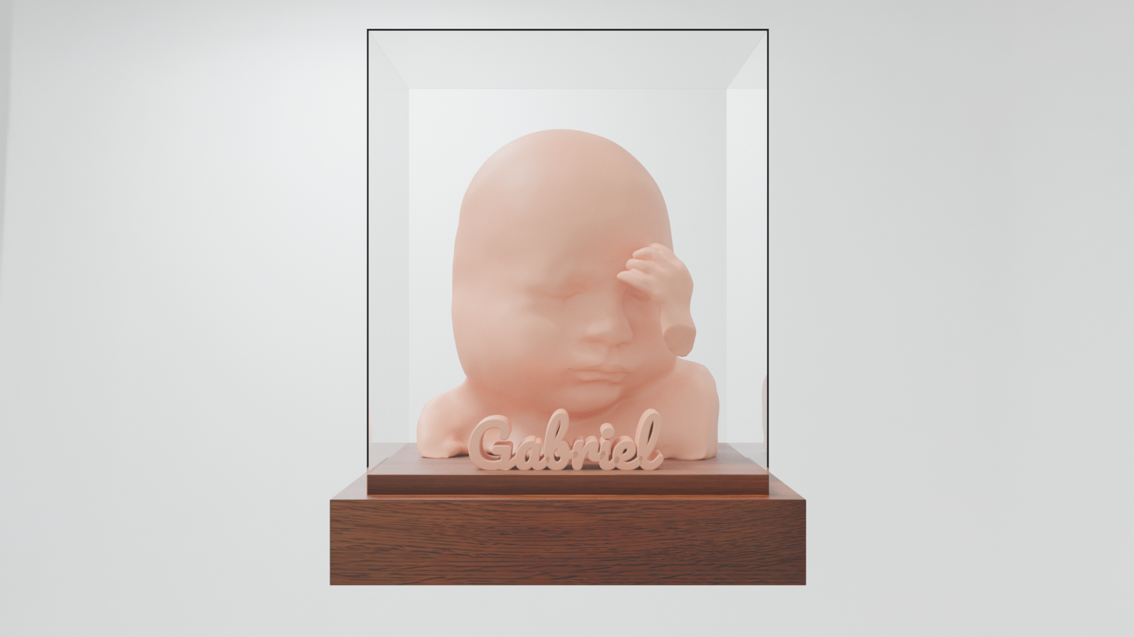 Creamos un modelo 3D personalizado del rostro do seu bebê a partir de suas imagens de ultrassom. Impresso em 3D na cor da pele, montado em base de madeira e protegido por uma cúpula de acrílico, é uma lembrança elegante, durável e cheia de significado — perfeita para presentear ou guardar para sempre
