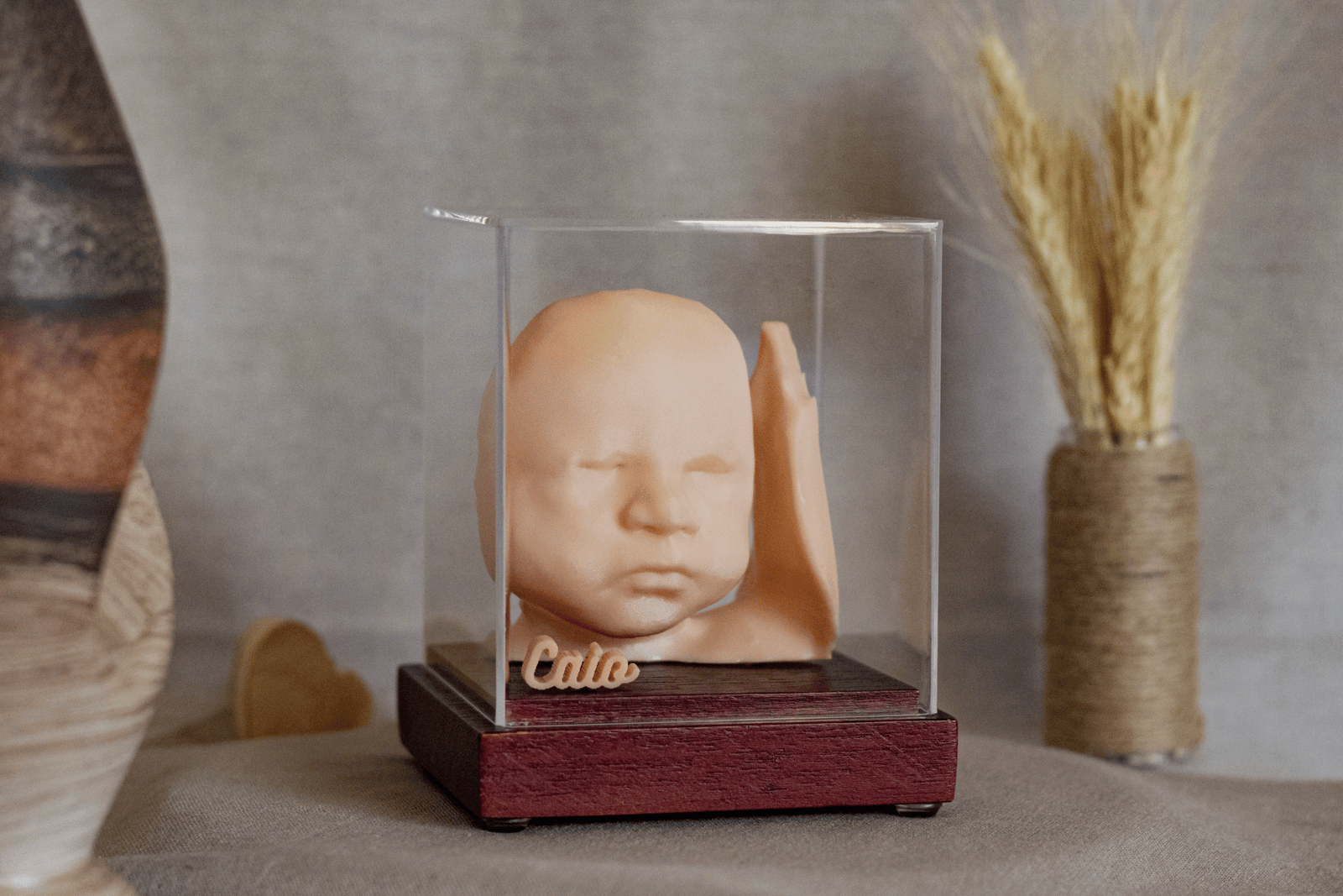 A combinação de materiais de alta qualidade, como madeira e acrílico, garante que este produto seja não apenas visualmente atraente, mas também durável e ecológico. O modelo impresso em 3D captura fielmente as feições do seu bebê com base em imagens de ultrassom, garantindo uma representação precisa e encantadora. Além disso, a cúpula de acrílico oferece proteção robusta, mantendo seu modelo a salvo de poeira, danos e dos efeitos do tempo.